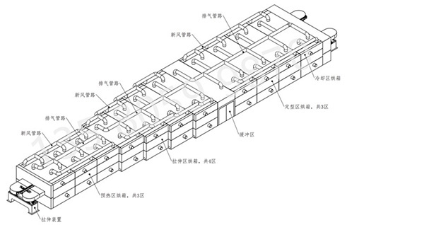 在橫拉設(shè)備中烘箱主要為薄膜預(yù)熱、拉伸、定型、冷卻過(guò)程中提供一個(gè)密閉保溫的空間,并且烘箱內(nèi)部按區(qū)域功能及一定間距為由隔斷板間隔開(kāi)。